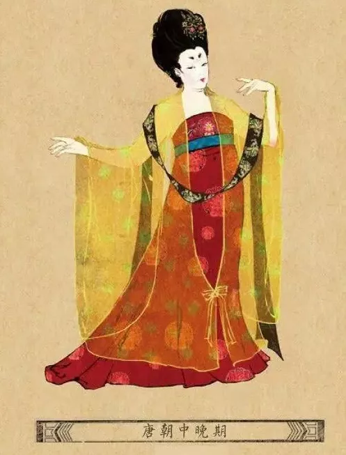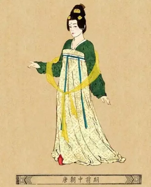 During the Sui Dynasty, a high-waisted long skirt with small sleeves was tied above the chest.A popular style of dress for women is the long, high-waisted skirt with small sleeves that is tied above the chest.For example, in Cave 390 of Dunhuang Mogao Grottoes, the sui women went to the altar. The lady wore a large-sleeved dress, and wore robes of rank or small-sleeved dress. This kind of dress was seen as early as in the buddhist story paintings in Dunhuang since the Northern Wei Dynasty, but the men wore small sleeves in the underwear and large sleeves in the coat.The sleeve size is the opposite of the sui Dynasty ladies' clothing.